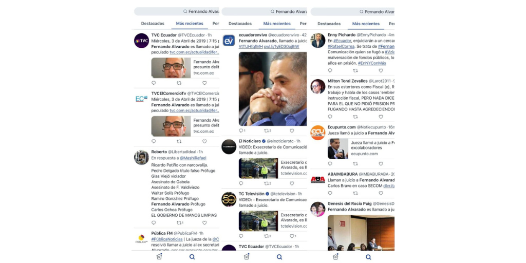 • La Fiscalía solicita a Fernando Alvarado rendir declaraciones en una fecha en que se conocía que él se encontraba fuera del país. A su llegada, el 8 de agosto, se dirige a Quito para rendir declaraciones de manera voluntaria. Sin embargo, son realizadas bajo resguardo policial por órdenes de la fiscal encargada. Esto bajo la excusa de supuestamente haberse negado a comparecer. Nunca se negó, fue citado cuando se conocía que se encontraba fuera del país y a su llegada se presentó de manera inmediata y por solicitud propia.