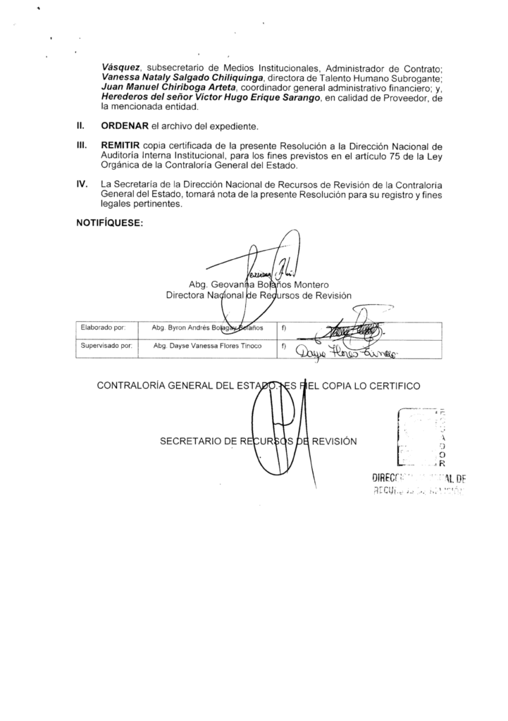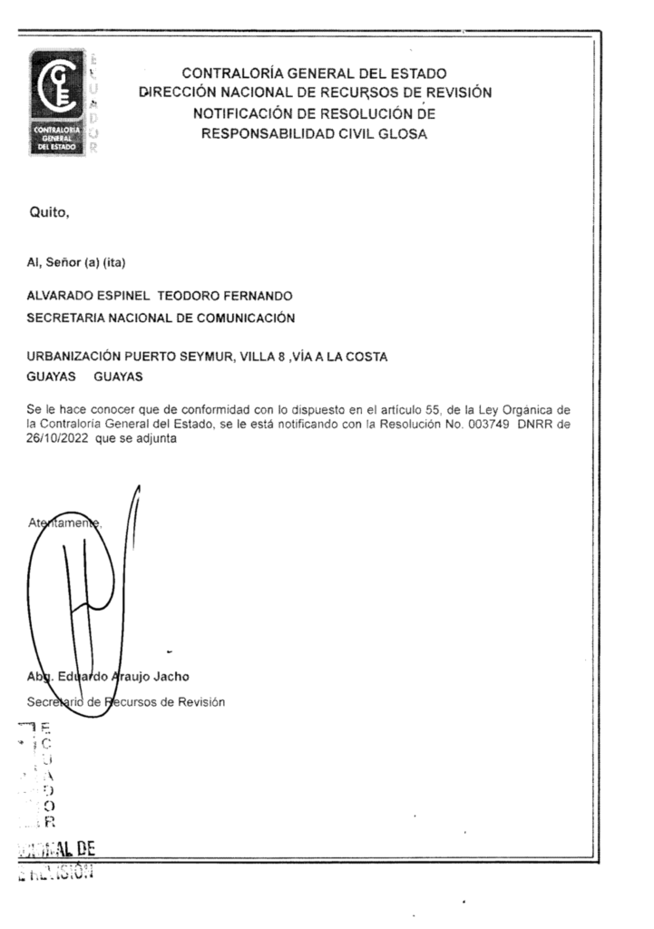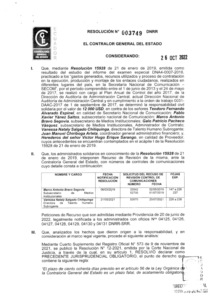 Hoy se ratifica que carecían de argumentos para acusarme, tanto que la Contraloría, el 26 de octubre de 2022 (se adjunta resolución al final de este artículo), no pudo continuar con su artificio y tuvo que ordenar el archivo del expediente. Y lo hace, como establece la Contraloría en la Resolución No. 003749, porque la entidad se vio obligada a declarar «la caducidad de la facultad del Organismo Técnico de Control para pronunciarse sobre la responsabilidad civil solidaria por el valor de USD 12.000 (…)».